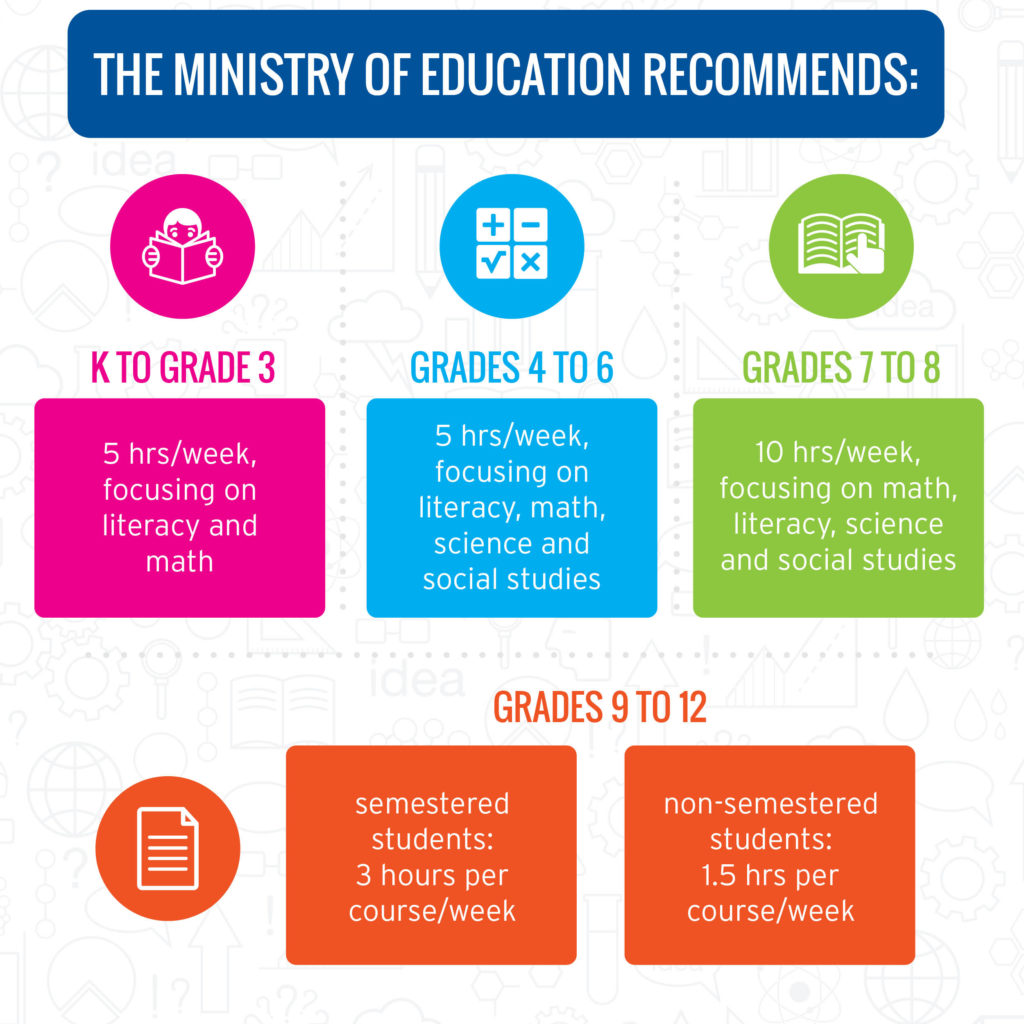 The Ministry of Education suggests the following guidelines for how much time should be spent on schoolwork each day, based on grades: