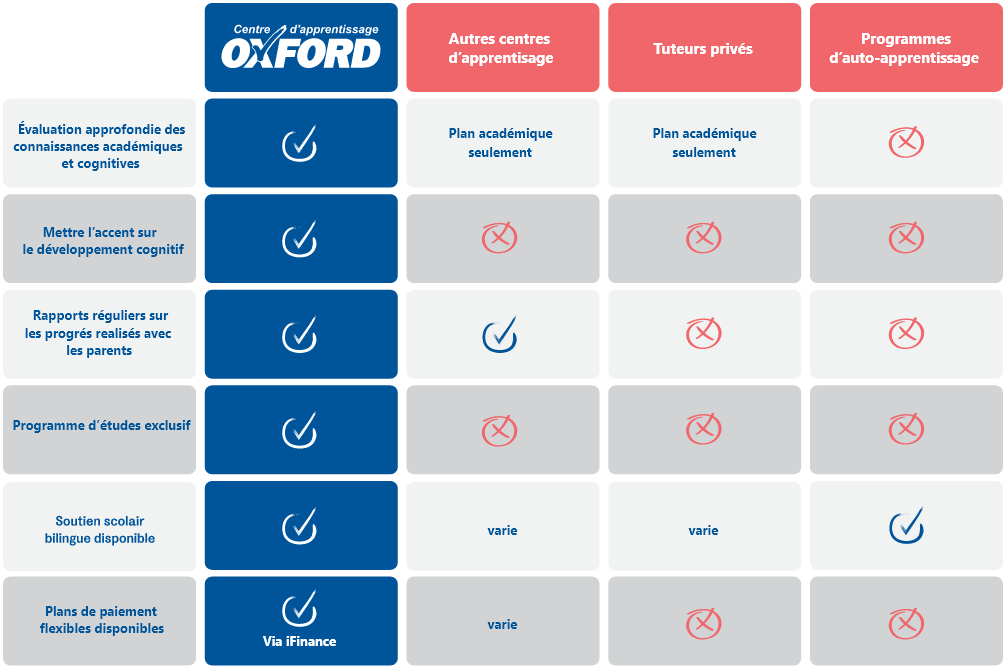 Qu'est-ce Qui Nous Distingue ? Programme propriétaire : apprentissage cognitif Oxford Learning est le seul centre de tutorat parascolaire qui se concentre sur le développement cognitif à travers une approche d'apprentissage cognitif. Ce style d'apprentissage encourage les élèves à utiliser leur cerveau plus efficacement en développant des compétences de pensée critique, des techniques d'apprentissage réflexif et la capacité de transférer de nouvelles compétences. Plus important encore, cette méthode d'apprentissage aide les élèves à développer les compétences nécessaires pour relever de nouveaux défis en comprenant comment trouver des solutions aux problèmes.